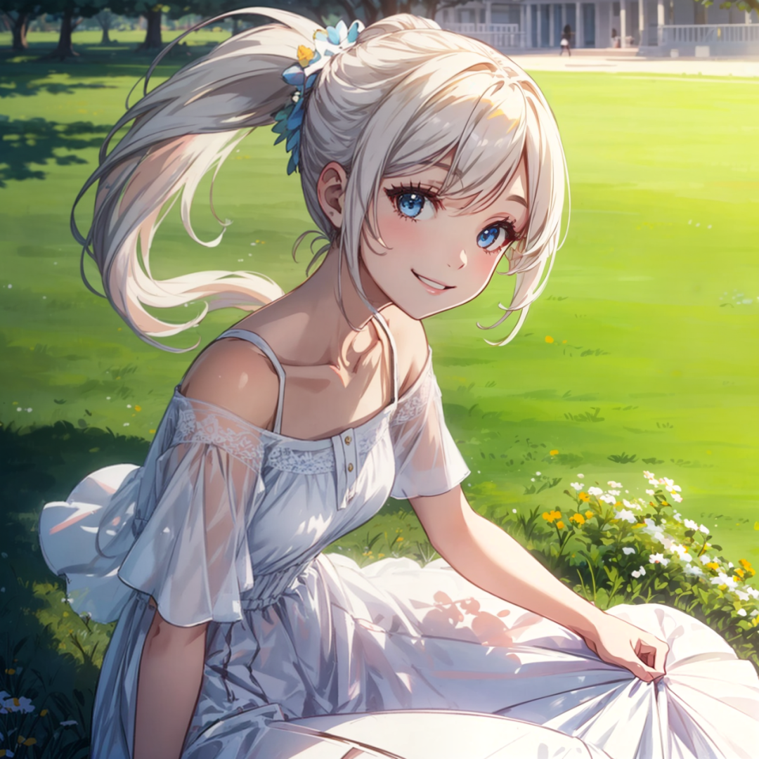 免费下载的高清原图,放大看细节也很能打,白裙子、马尾辫、草地等关键词都一一呈现了。