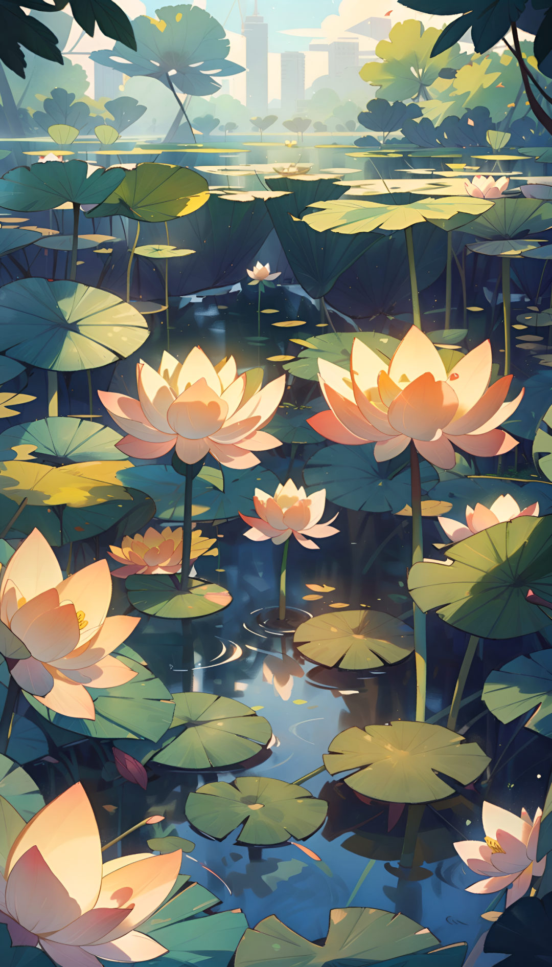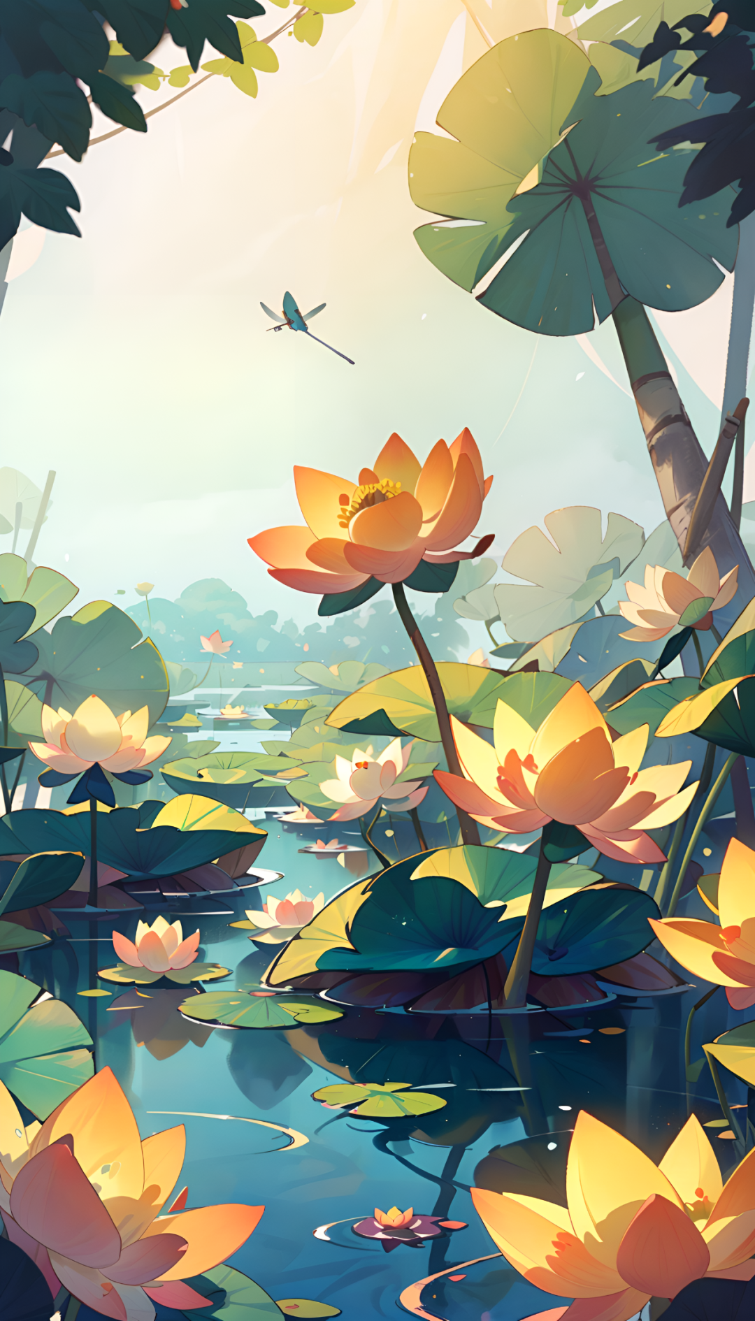 描述词:夏天的池塘,荷花,荷叶,莲荚,蜻蜓,散焦,柔软,干净透明,大气,超高清