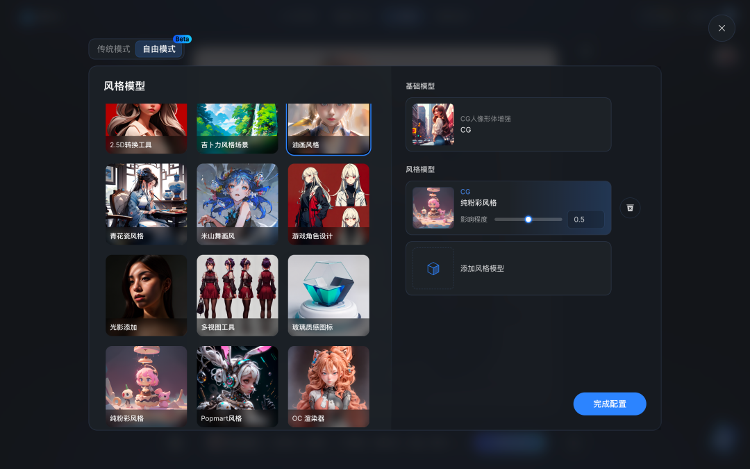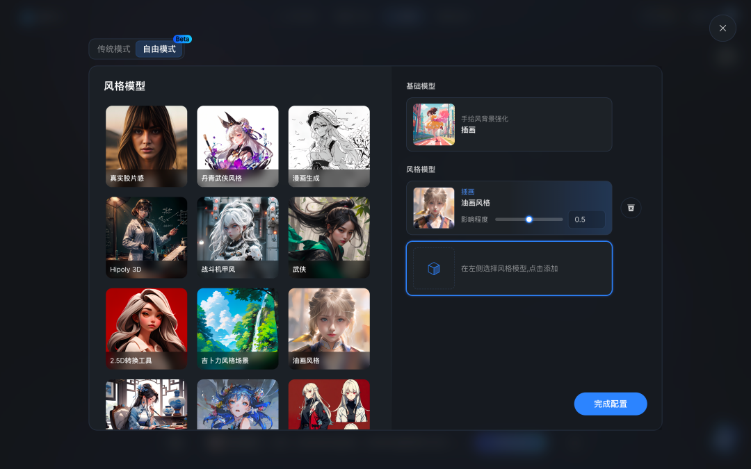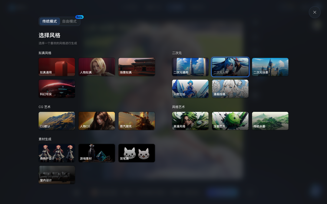 掌握基础用法后,我们开始上点儿难度——尝试用「自由模式」中的上百种模型组合出我们最需要的 AI 作品风格。