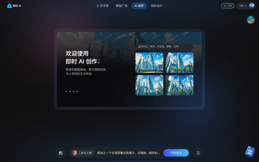 进入首页后,页面功能和引导非常清晰,点击【开始生成】按钮,就能用预设的模型和关键词快速开始第一次创作。
