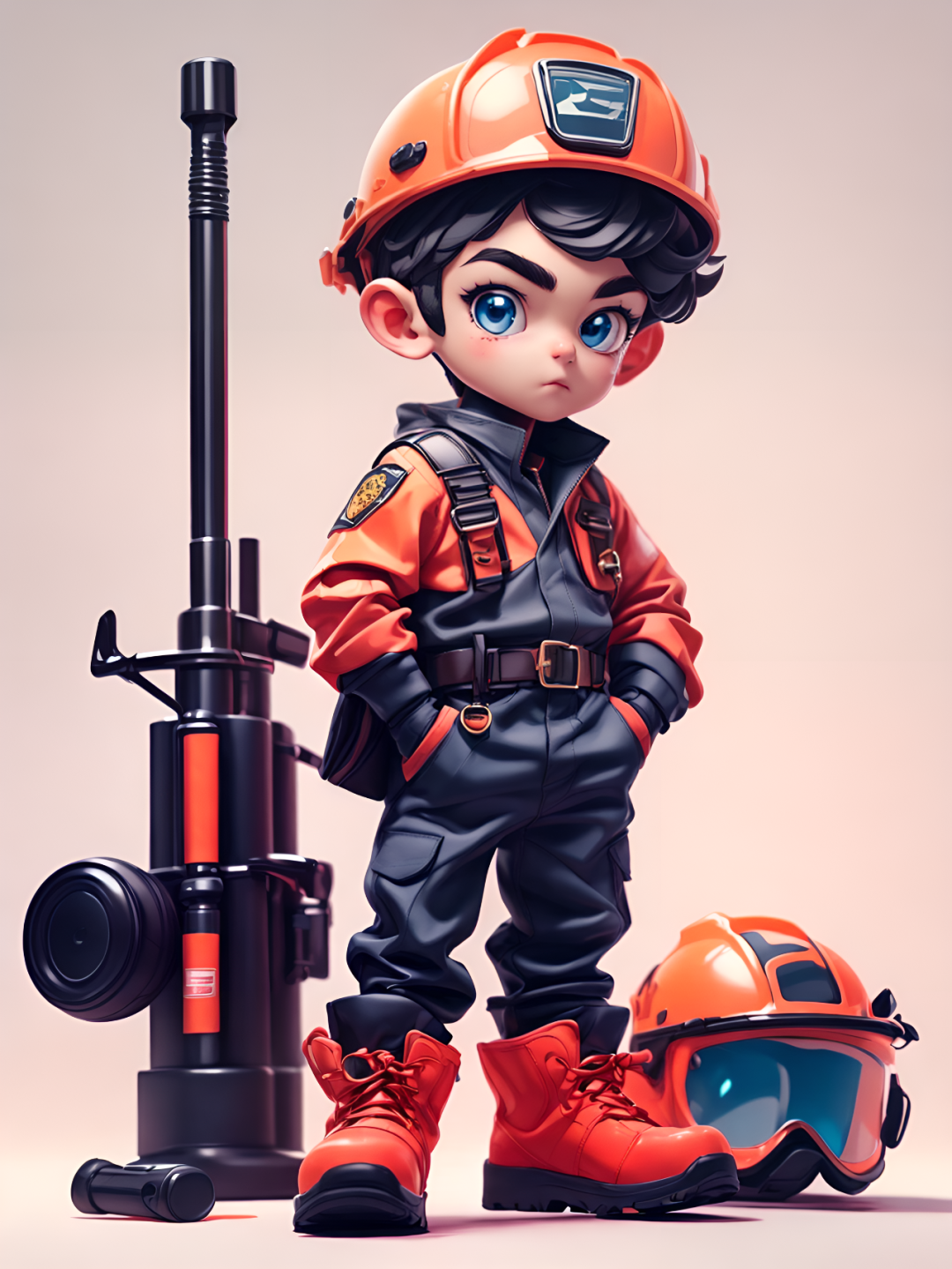 描述词:自然光,一个男孩,消防员,头盔,靴子,黑色鞋子,手套,腰带,站立,连体裤,看着观众,橙色裤子,裤子,(全身:1.3),简单背景。
