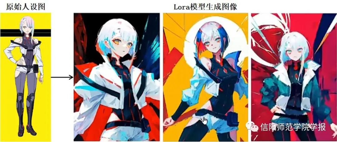 如果使用者想要生成特定动漫人物的图像,则可借助Lora模型实现这一目的。Lora的英文全称为Low-Rank Adaptation of Large Language Models,主要用于处理大模型微调的问题。AI绘画软件中的Lora模型插件提供了更加便捷与自由的微调模型,能够帮助使用者更加精准地生成指定的绘画风格和人物角色。例如,如果想要生成动画《赛博朋克:边缘行者》中的角色Lucy的图片,那么创建这一人物造型相关的Lora模型所需的图片数量远少于一般的绘画模型,而且生成的人物也能稳定且准确地复制原有的人物白色短发、纤细身材、混搭服饰等形象特点。如图10所示。