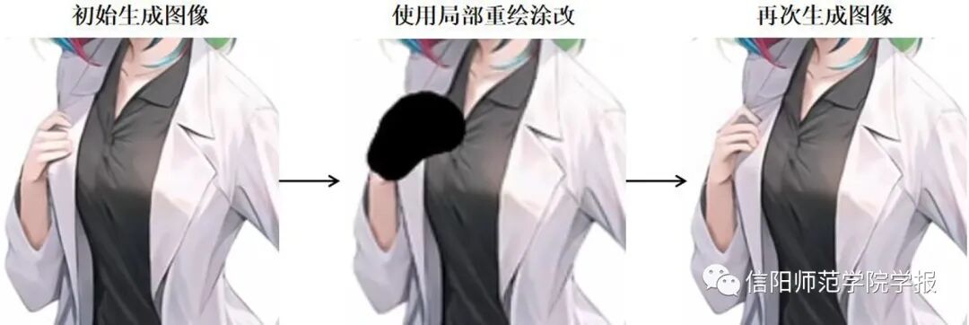 如果AI生成的人物形象的某些部位出现问题,使用者亦可在局部重绘界面对图像进行快速修改。例如,如果生成人物的手部出现多指、扭曲等畸形现象,则可将图片的所有的原始tag,也就是提示词复制到Prompt栏目,然后使用笔刷涂抹需要修改的部位,即可通过再次重绘来矫正畸形部位。如图7所示。