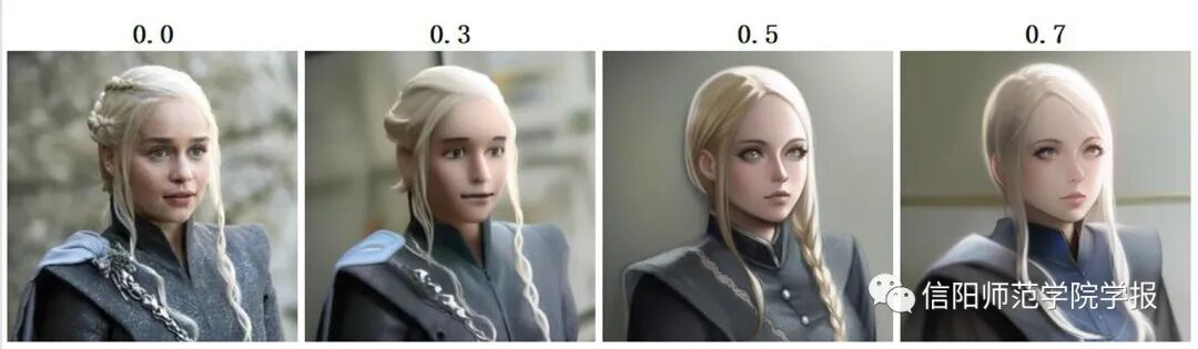 如果想要混合不同画作的绘画要素,使用者可以在Novel AI的模型合并操作页面中将模型A和模型B两种绘画模型合并为一个新的绘画模型。并且通过调整两个模型之间的输出比率,可以决定二者绘画风格的混合比例。例如,将电视剧《权力的游戏》的角色丹妮莉丝·坦格利安的真人图像与Novel AI原有的2D动漫风格的绘画模型进行合并,之后按照不同输出比率(Multipliter参数)生成的人物形象如图 9所示。可以看出原有2D绘画模型的输出参数越高,AI生成人物的绘画风格就越接近2D动漫。