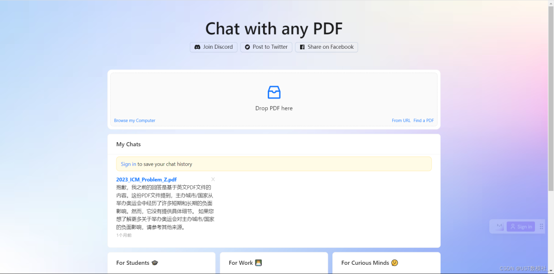 类似于chatdoc,是一款可以快速帮忙理解、分析文档,总结pdf文档的在线工具,效果用起来不错,可以对它提问任何关于这份 PDF 的问题,非常适合快速提取各种 paper 论文的摘要。