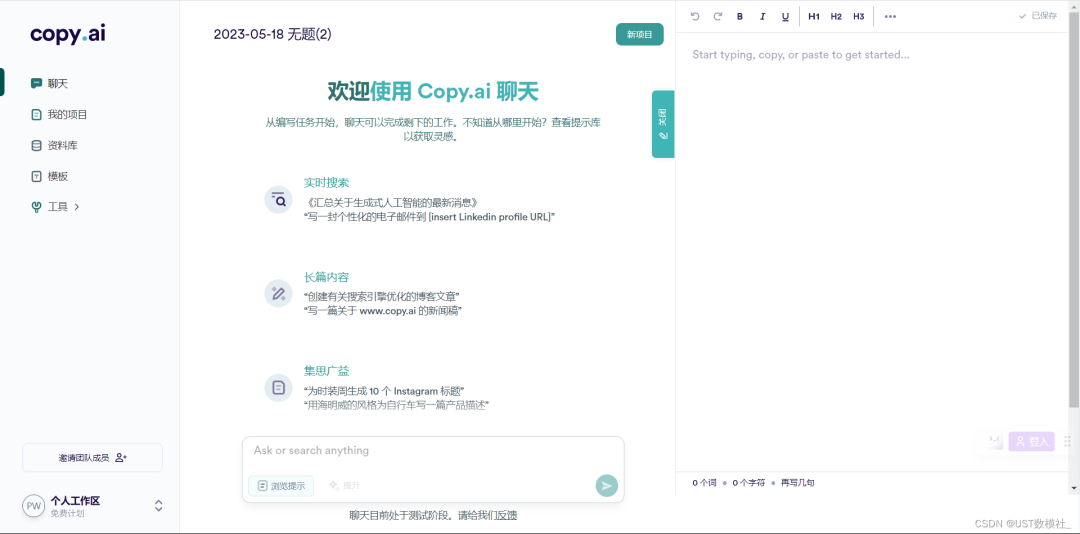一款比较强大的AI写作工具,部分功能使用免费,也可以升级到pro,体验更强大的功能,还挺好用的,对话式生成内容创作。