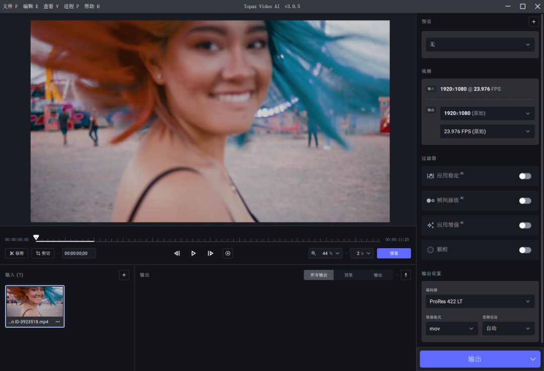 最后就是点击输出,模型需要在线下载,会比较慢,导出所需时间与电脑硬件,以及视频时长,修复分辨率帧速率等等都有关系。此外在首选项设置里边,可以选择GPU加速,可以设置最大处理线程。