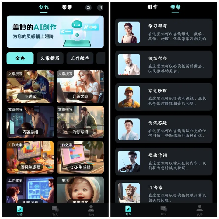 AI创作家也是现在可以免费下载使用的软件,无需翻墙。主要可以通过对话的方式,辅助我们进行文章、歌曲的创作,它的衍生功能也特别丰富,分析星座运势等、教你学习、做饭、面试答疑样样精通。