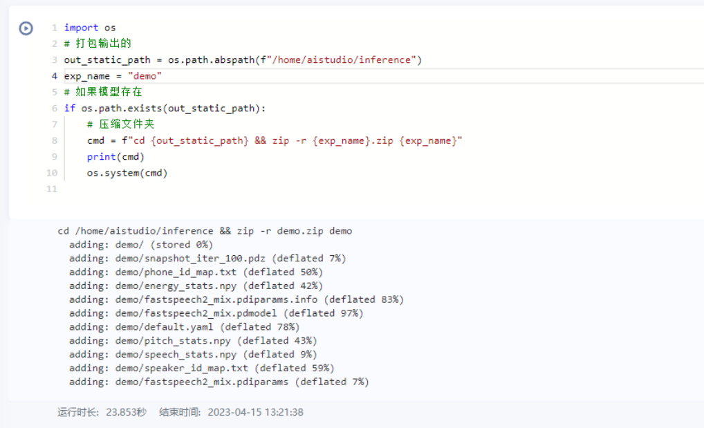 训练成功的声音模型,经过数据模型压缩后,会在inference文件夹下生成一个名为demo.zip的文件。我们能够利用这个模型将各种文本转化为自己的声音。