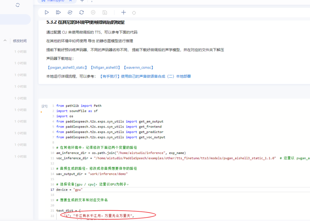 在执行5.3.2在其它的坏境中使用微调后旳模型这一步骤时,我们可以在text_dict变量的括号中输入所需生成的声音文本。