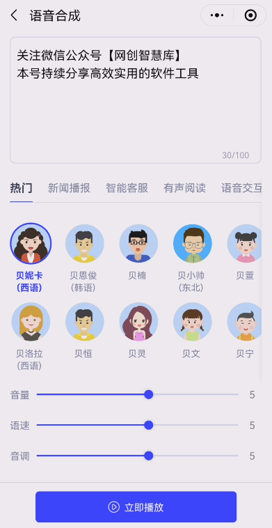这款AI配音工具中的智能语音合成选项中,也有非常丰富的音色发音人,像新闻播报、智能客服、方言、明星、对话、童声等,都可以任意选择使用!