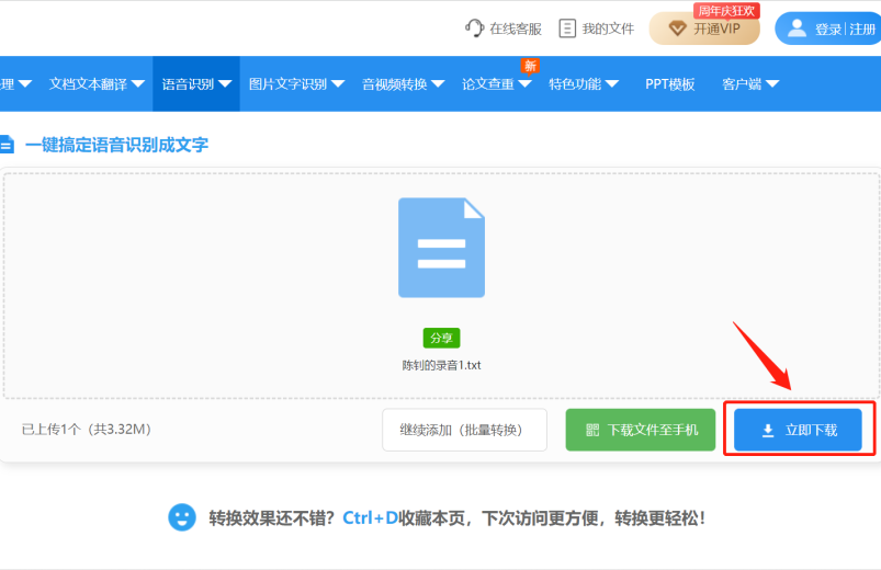 小编体验:无需登录,一键下载。除了语音转文字,该平台还提供文档转换、文字识别、文档翻译等服务,有需要的老师也可以试试。