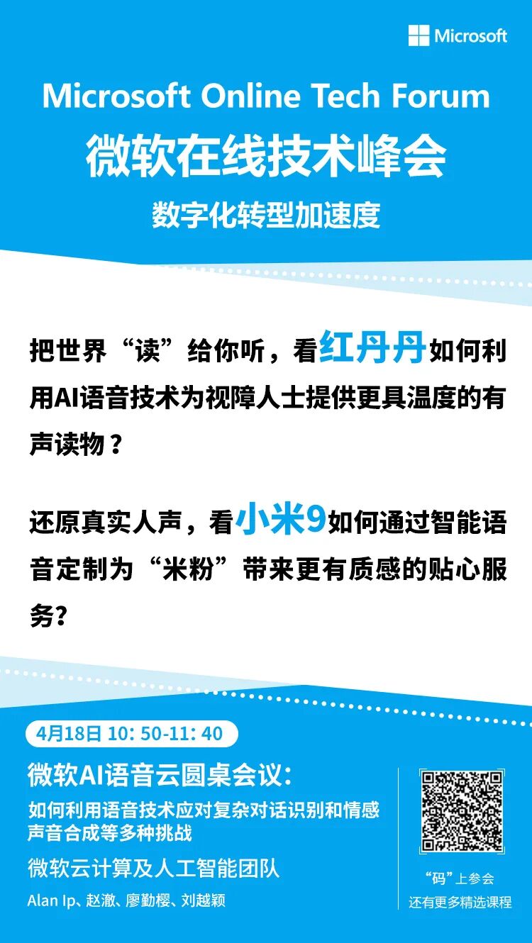 4 月 17-18 日,为期两天的微软在线技术峰会特在 18 日当天设置了全天的【 AI&IoT】 专场,届时将会在此专场下进行针【微软 AI 语音云圆桌会议:如何利用语音技术应对复杂对话识别和情感声音合成等多种挑战】的内容分享,通过技术实现到场景应用,集中介绍微软在 AI 语音方面的最新成果,扫描下方二维码即可报名参加。