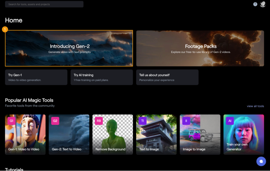RunWay 的视频编辑模型有 Gen-1 和 Gen-2 两个模型,Gen-1 支持用视频生成视频,Gen-2 支持根据文本提示或现有图像随时预览和修改生成的影片。该产品为付费产品,邮箱注册后,可以免费生成3个单个时长4秒的视频。(多换几个邮箱注册可以多生成几次)