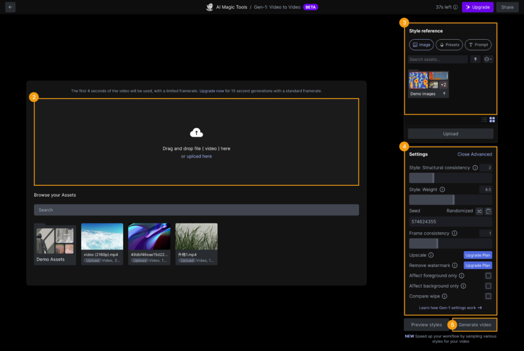 2.不付费的情况下,可以免费试用 105 秒(右上角显示剩余额度),每个视频为 4 秒,也就是能免费生成 26 个 Gen-2 视频。