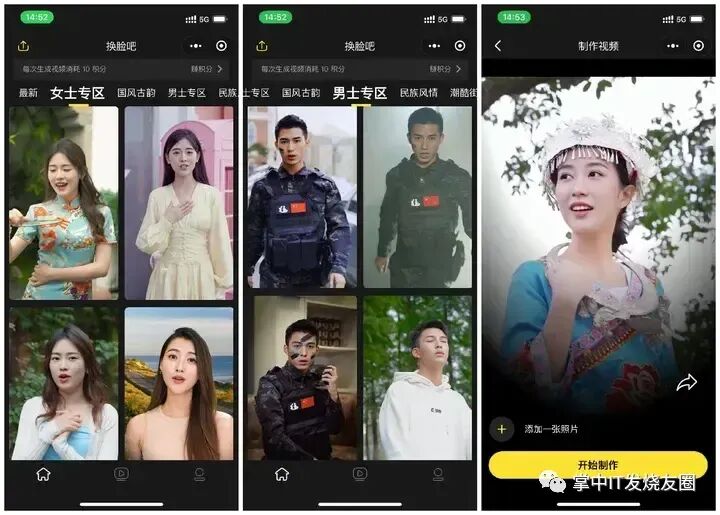 点击一个喜欢的模板它就会自动帮你处理,将你所上传的图片中的人脸换到视频上去。