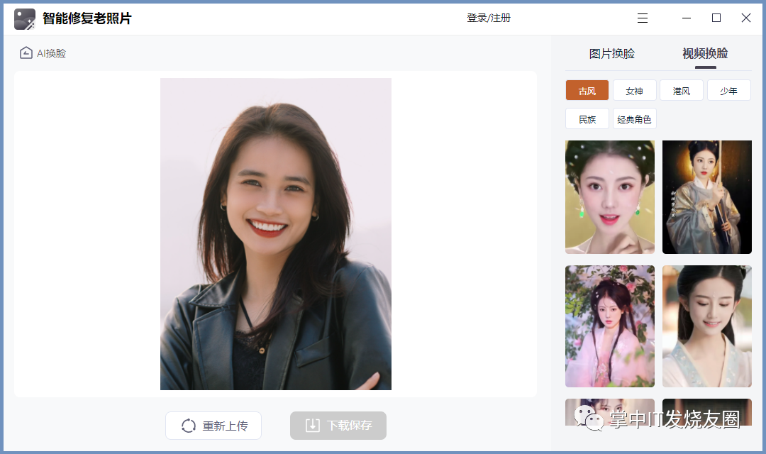打开之后点击首页的【AI换脸】,先上传一张照片,照片上传之后可以看到右侧的换脸模板,包括图片以及视频换脸,里面有各种风格的换脸模板可以选择。