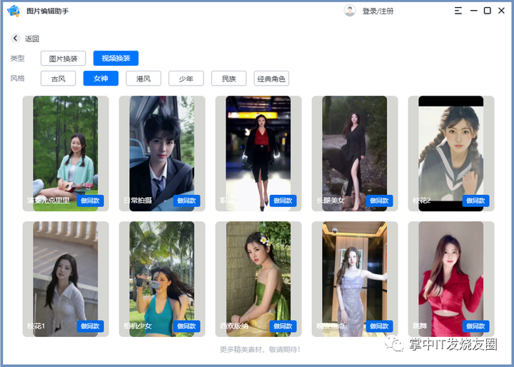 打开软件之后点击【一键换装】,它支持视频换装以及图片换装,里面有丰富的换装模板可以使用。操作都非常简单,只需要点击【做同款】上传自己的照片,等待片刻之后,我们就可以得到变脸换装后的效果。
