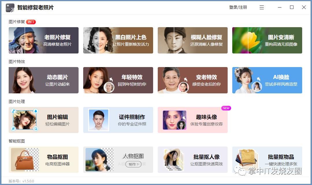 一款主打老照片修复的软件,有电脑端、手机端以及微信小程序端,可以修复照片、模糊人脸变清晰、照片上色、编辑图片、AI换脸、趣味头像DIY、抠图等。