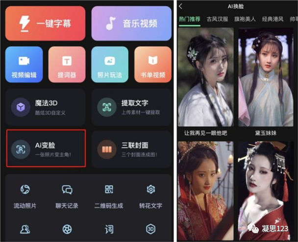 这是一个用来给视频加字幕的app,进入app可以看到它有一个AI变脸的功能,有古风汉服、旗袍美人、经典港风等多种模板,想要什么风格都有。