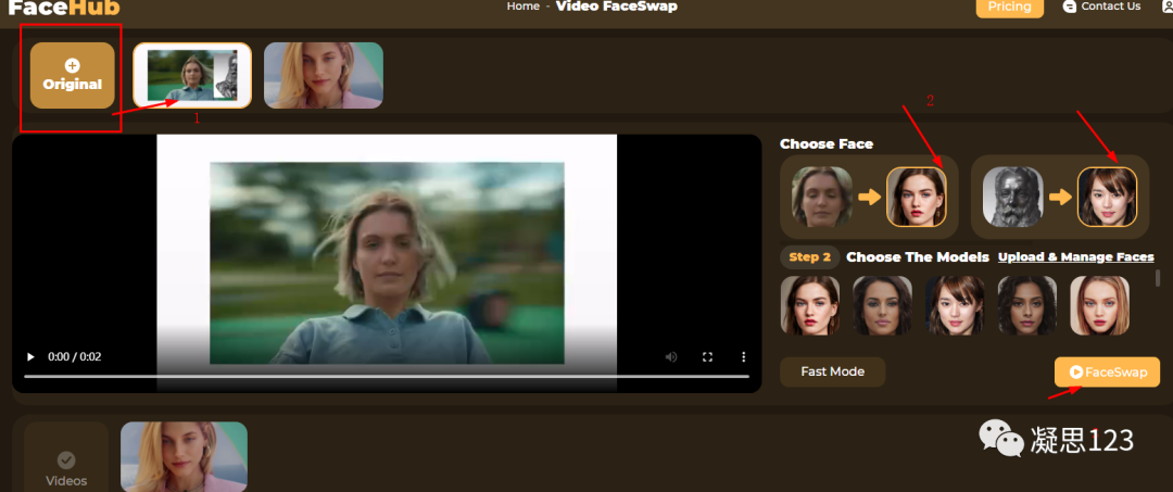 不需要安装,这是网页版,直接用,免费注册,操作超级简单,就三步:1导入视频,2选择替换的脸(这个视频里有两个脸,所以可以换两次)3转换: