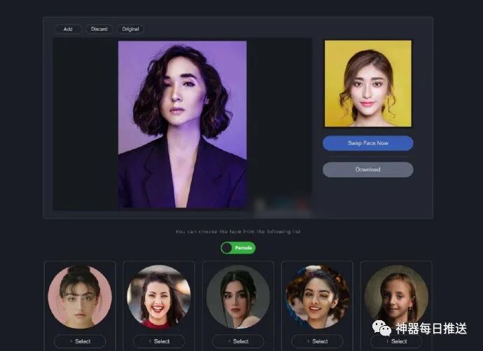 FaceSwapper是一款免费在线智能AI换脸工具/换脸软件, 支持男女性别换脸,使用的适合只需上传要换脸的照片(支持jpg和png格式),然后选择一个需要变换的脸型,也可以用自己准备好的,然后点击立即换脸即可轻松完成完成,支持换脸后照片下载,使用免费无限制。