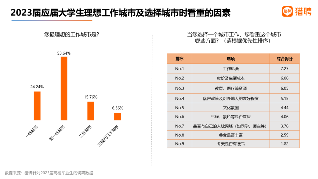 猎聘针对2023届应届生的调研显示,53.64%的应届生表示最理想工作城市是新一线城市,其次是一线城市(占比24.24%)。在选择城市时,应届生最优先考虑的前四要素是:工作机会、房价及生活成本、教育、医疗等资源、落户政策及对外地人的友好程度。新一线城市近几年迅速崛起,出台了各种优厚的招才引智政策。生活成本较低而品质较高,渐成气候的产业集群,使得新一线城市成为应届生青睐的潜力股。