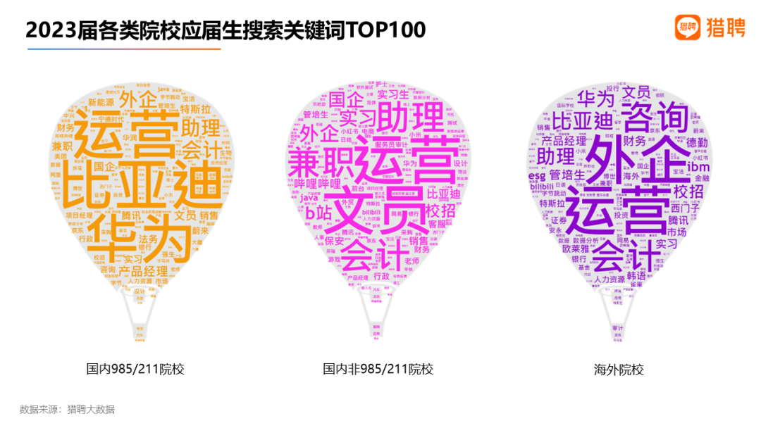 对比2023届国内985/211院校、非985/211院校与海外留学毕业生在猎聘平台搜索关键词TOP100发现,985/211院校和海外留学毕业生侧重搜索具体公司——前者更熟悉国内产业情况,更偏重科技大厂、新能源车企;后者有国际化背景优势,更侧重外企。非985/211毕业生侧重具体岗位。可见,985/211毕业生和海外留学生求职目标更清晰。