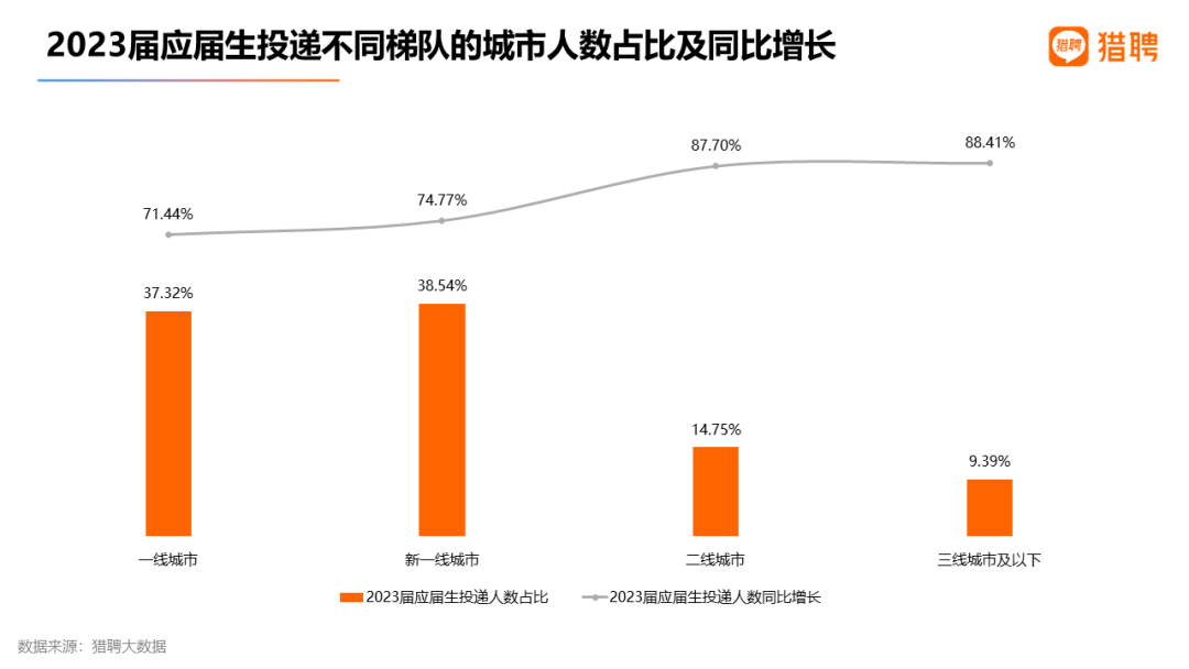 从2023届应届生投递不同梯队的城市来看,新一线城市占比最高,为38.54%;其次是一线城市(37.32%)。投递各梯队城市的应届生人数较上届同比增长均超70%,排序为:三线城市及以下(88.41%)>二线城市(87.70%)>新一线城市(74.77%)>一线城市(71.44%)。