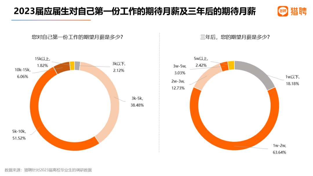 3)超5成应届生首份工作期待月薪5千-1万,超6成期待三年后月薪1万-2万