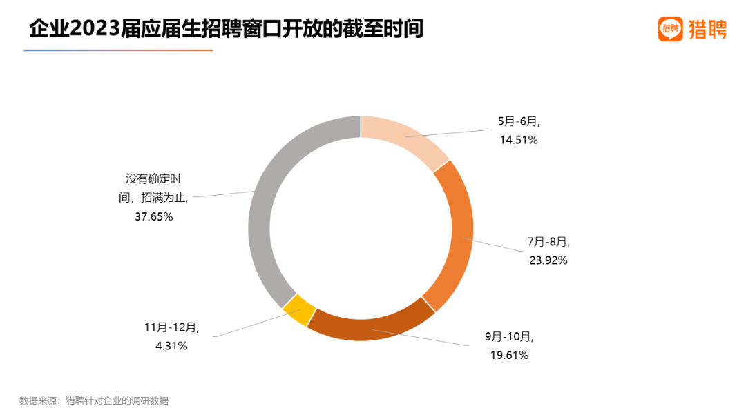 本届校招窗口期持续多久?37.65%的企业没有确定时间,招满为止;23.92%的企业最晚到7-8月;14.51%的企业为5-6月;19.61%的企业为9-10月。猎聘职场顾问建议还未找到工作的应届生抓紧窗口期,尽早落实工作,安顿身心。