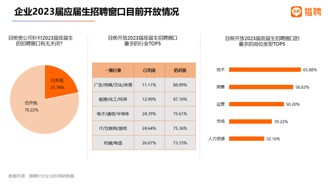 2、目前有近8成企业开放校招窗口,广告/传媒/文化/教育机会最多,技术岗招聘力度最大