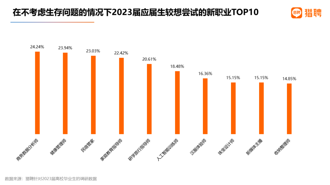 当问及应届生在不考虑生存问题的情况下较想尝试哪些新职业?答复中位居前五的是商务数据分析师、健康管理师、民宿管家、家庭教育指导师、研学旅行指导师,得票率均超20%。值得注意的是,人工智能训练师位居第六,颇受欢迎,这与最近ChatGPT带火人工智能紧密相关。