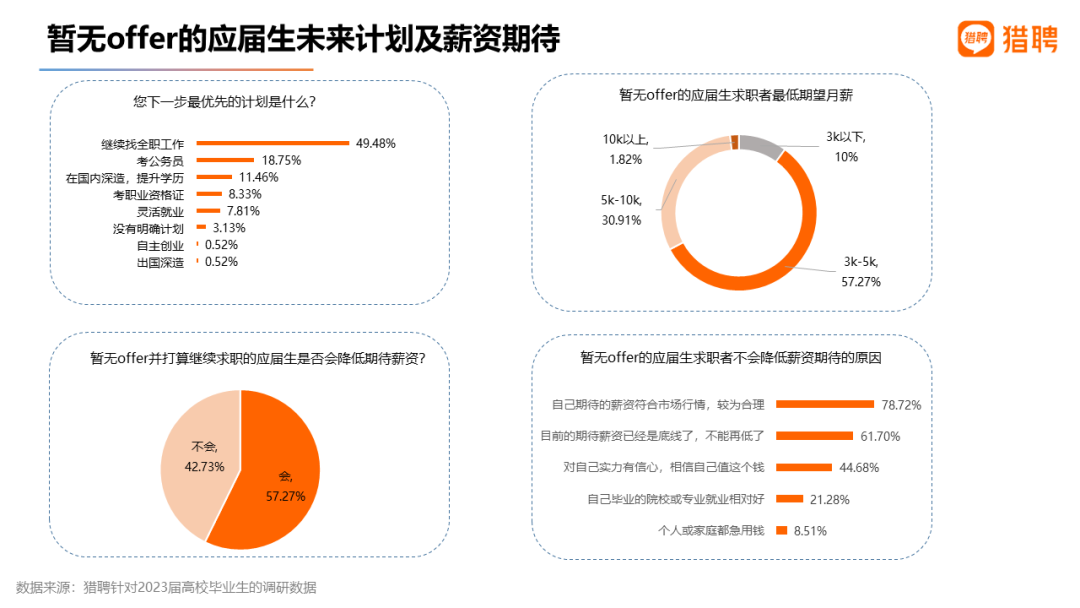 3)暂无offer的应届生:近5成继续求职,求职者中近6成会降低薪资期待