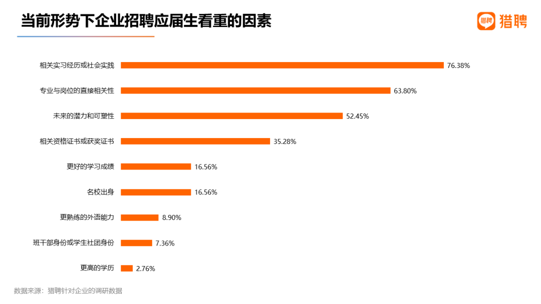猎聘调研显示,企业招聘应届生最看重三大要素:相关实习经历或社会实践、专业与岗位的直接相关性、未来的潜力和可塑性,得票率为76.38%、63.8%、52.45%。相关资格证书或获奖证书位居第四(得票率35.28%);名校出身、更好的学习成绩并列第五,得票率均为16.56%。猎聘职场顾问建议大学生在校期间就应重视实习,多争取为自己增值的实习机会,增强自身竞争优势。