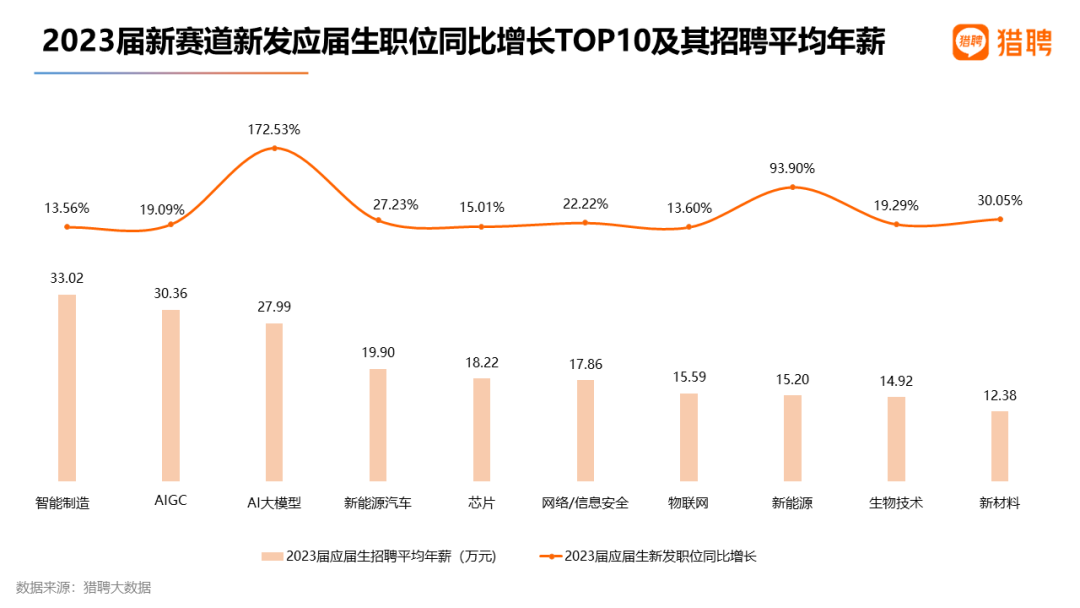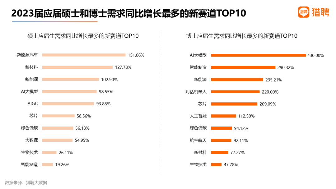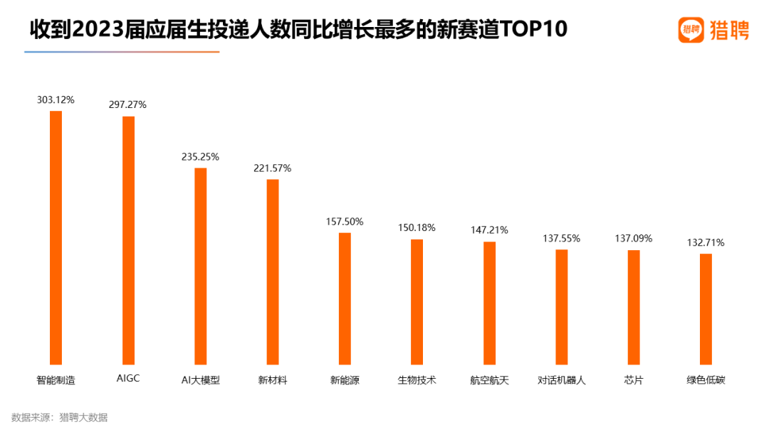 在2023届硕士应届生需求增长最多的TOP10新赛道中,新能源汽车、新材料、新能源包揽前三,同比增长151.06%、127.78%、102.90%;AI大模型和AIGC位居第四、第五,增长率为98.55%、93.88%。
