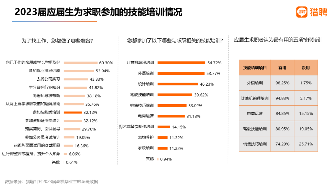 应届生求职者为找工作做了哪些准备?本次调研显示,排名前二的是向已工作的亲朋或学长学姐取经参加就业指导讲座。此外,32.12%的应届生参加过技能培训,计算机编程、外语、设计、驾驶技能培训排名前四。最受肯定的是外语、计算机编程、电商运营、驾驶技能培训,分别有98.25%、94.83%、84.85%、80.95%的参与者认为对求职有用。