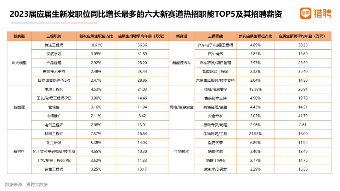 比较应届生职位增长最快的六大新赛道(AI大模型、新能源、新材料、新能源汽车、网络/信息安全、生物技术)中新发职位最多的三级职能TOP5发现,每个新赛道热招职能的应届生招聘平均年薪差别较大,从十万左右到二十几万、三四十万不等。相较而言,通用类职能如市场、行政、销售薪资相对较低,而科技属性、技术含量高的职能无论职位占比还是薪酬也相对较高,再加上新赛道本身的行业优势加持,薪资竞争力较强。例如,AI大模型职位占比最多的是算法工程师,招聘平均年薪最高的是深度学习,为41.89万,薪资领先六大新赛道TOP5职能。新能源职位占比最多和招聘平均年薪最高的均为电池工程师,为21.03万;新能源汽车占比最高的是汽车电子/电器工程师,招聘平均年薪居首的是智能网联工程师,为39.40万。