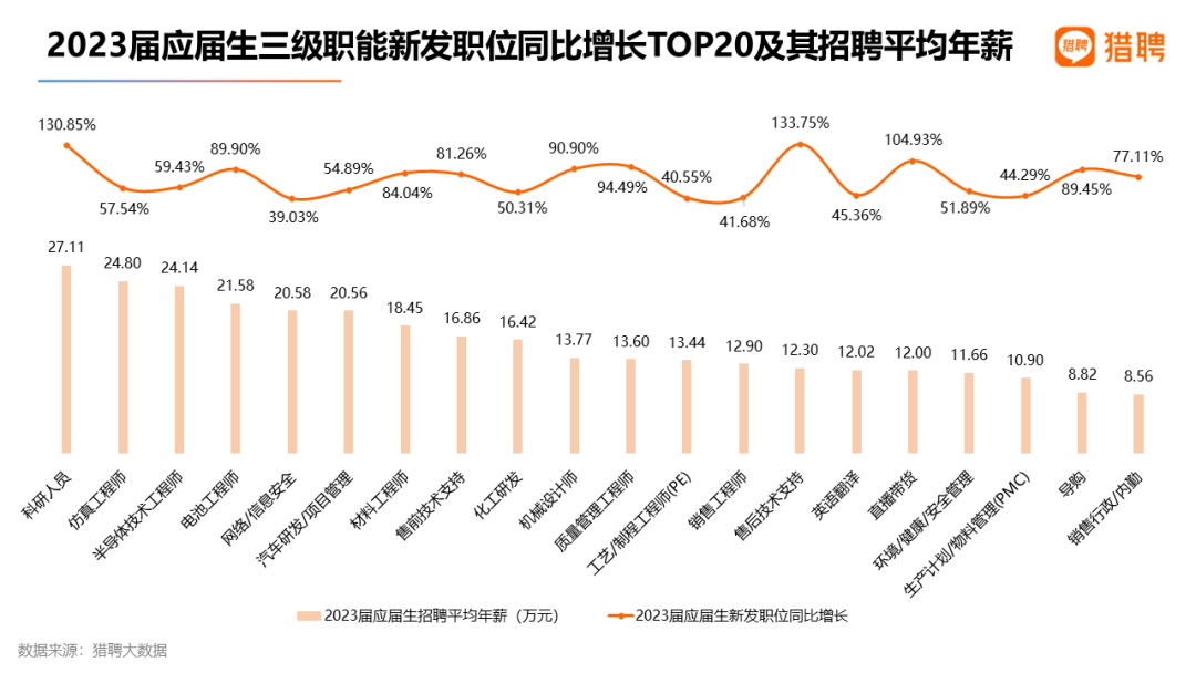 2)职类:售后技术支持、科研人员、带货直播应届生职位增长均超100%