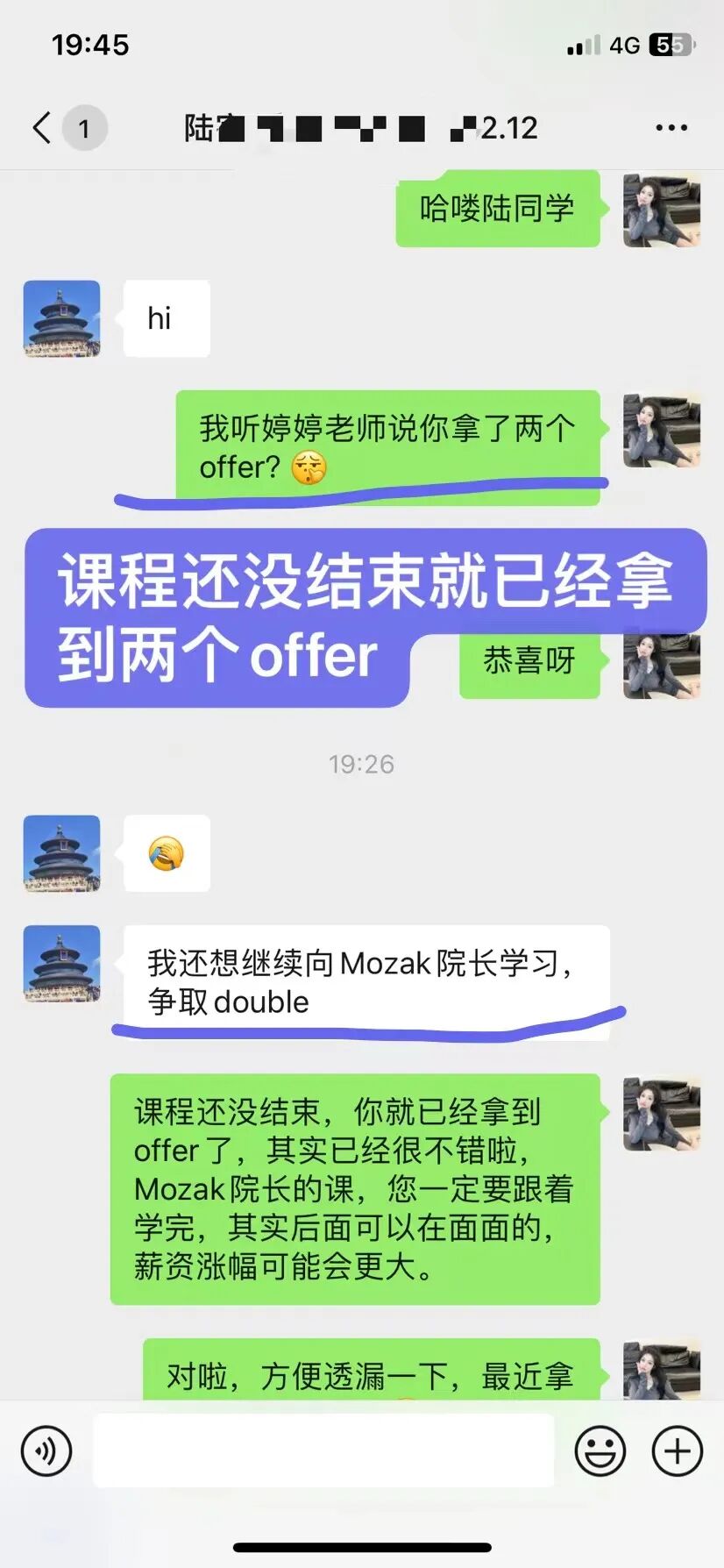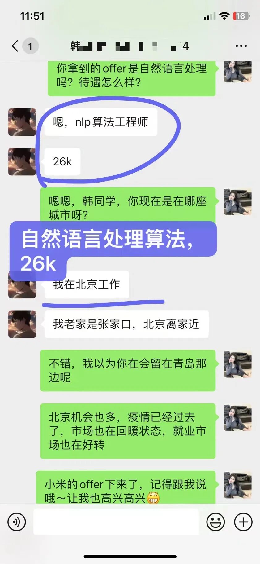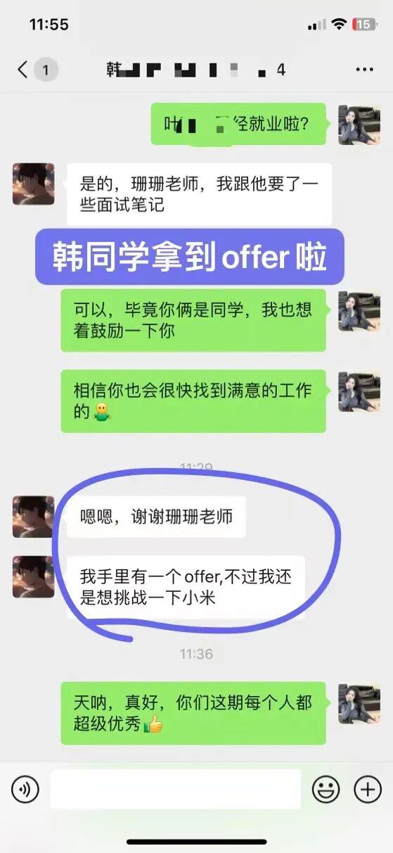 4、韩同学应届生学习前一直担心课程质量及就业问题,经过几个月学习后,成功的拿到26k自然语言处理算法offer,还有一个小米的offer。