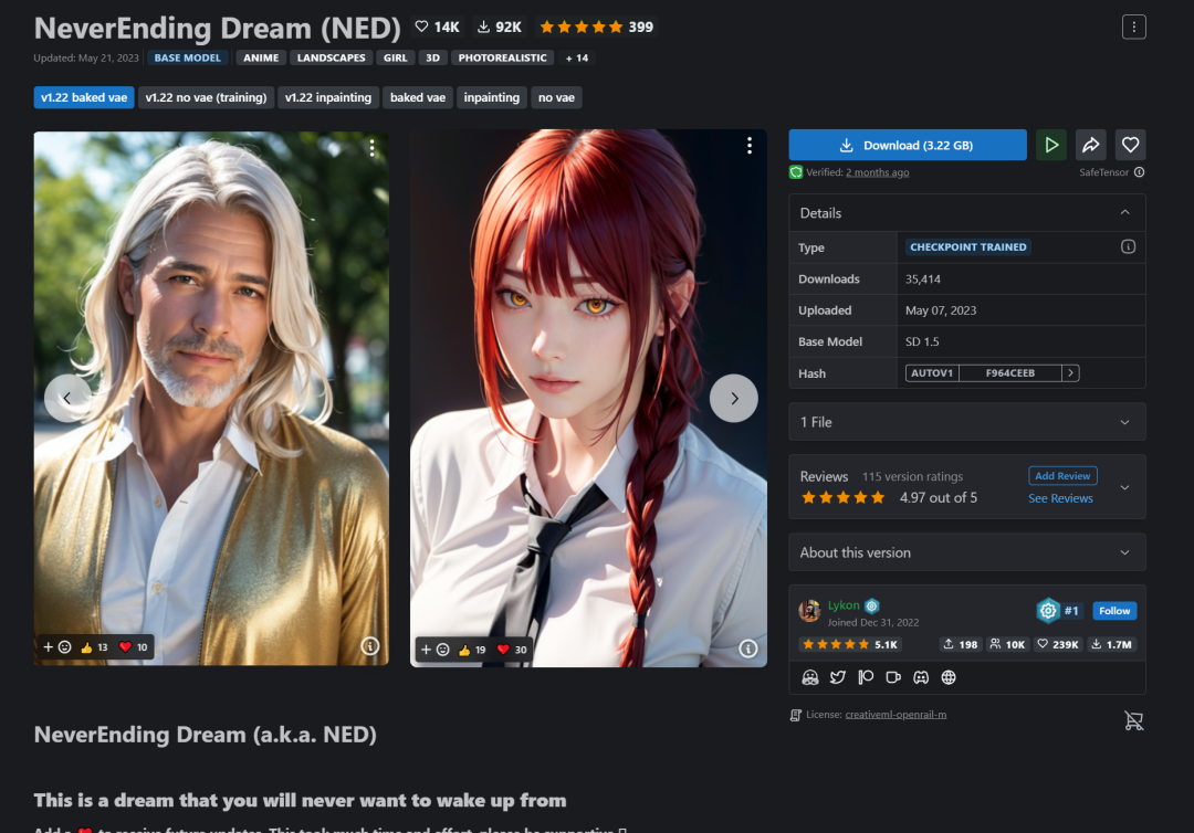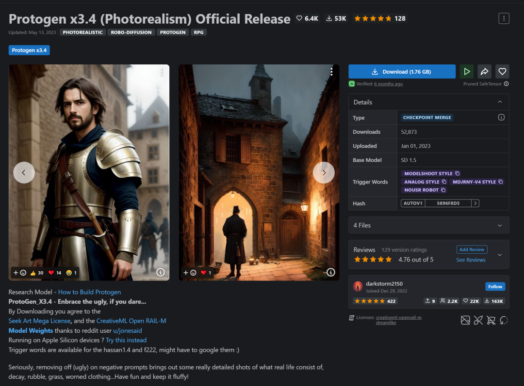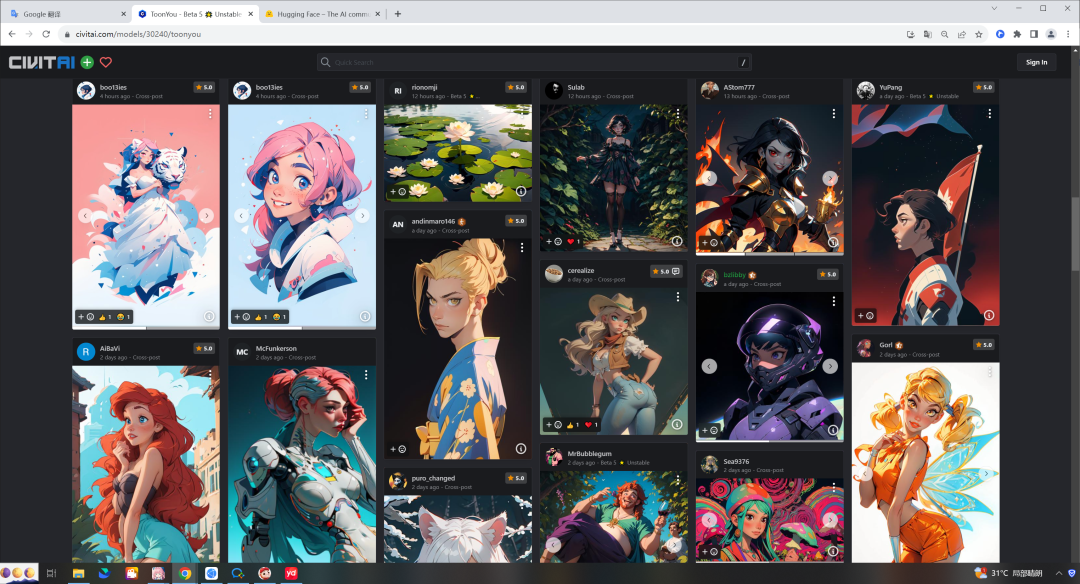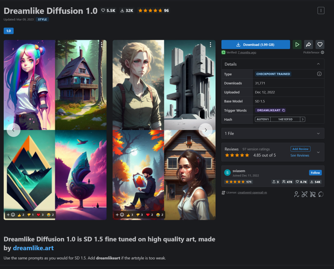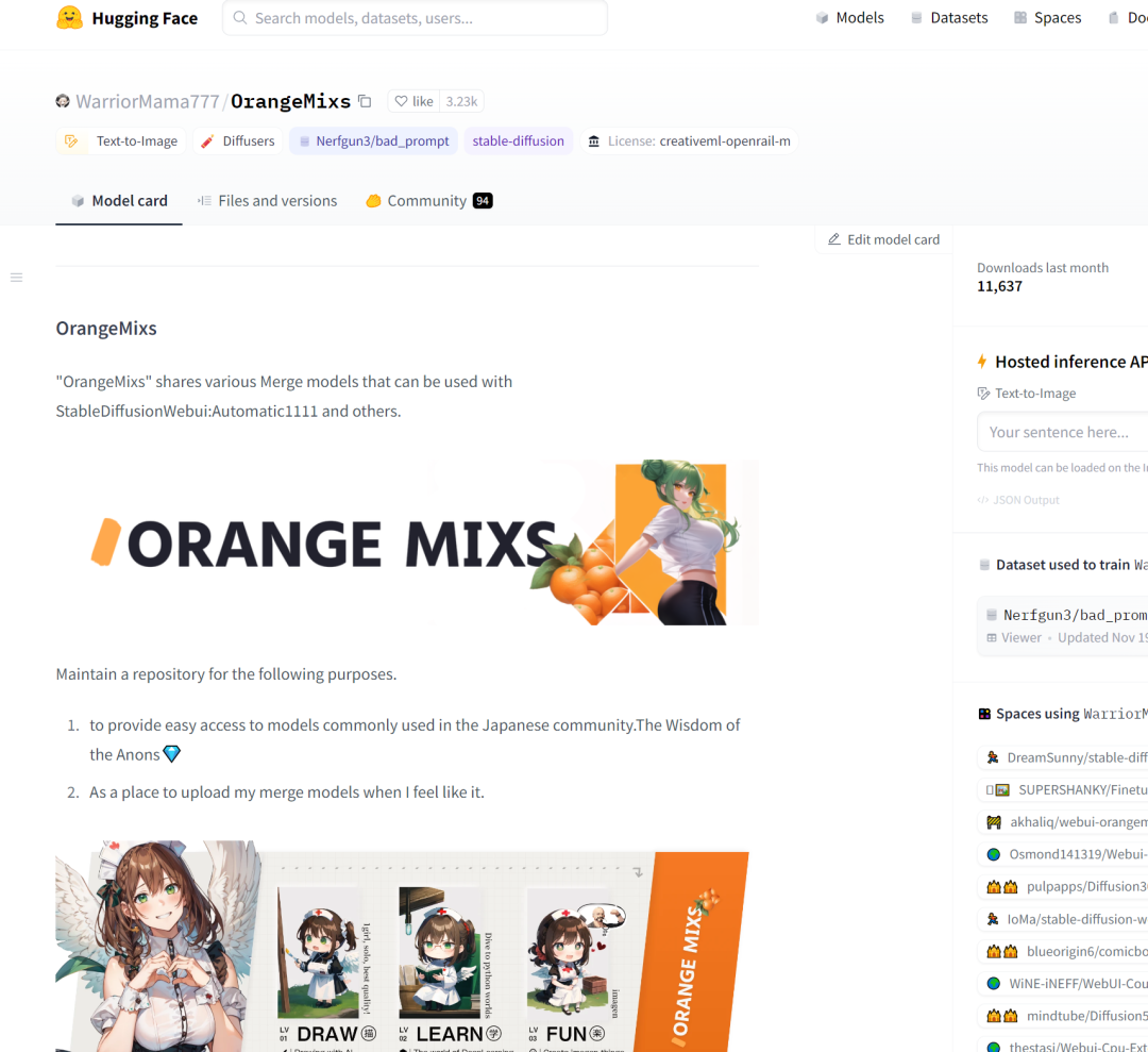 它是一个允许用户共享AI学习模型和数据集的平台,包含的内容非常广,很多AI领域的东西都有。不过这个平台的专业门槛有点高,第一次接触容易让你头大,最上方的搜索栏里输入Stable DIffuion你可以直接下载到官方发布的历代模型。而在左边的筛选栏里,点击Text-to-Image标签,你就能筛选出来其他用户发布的用于AI绘画的文生图模型了。