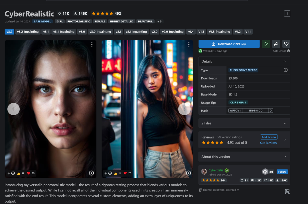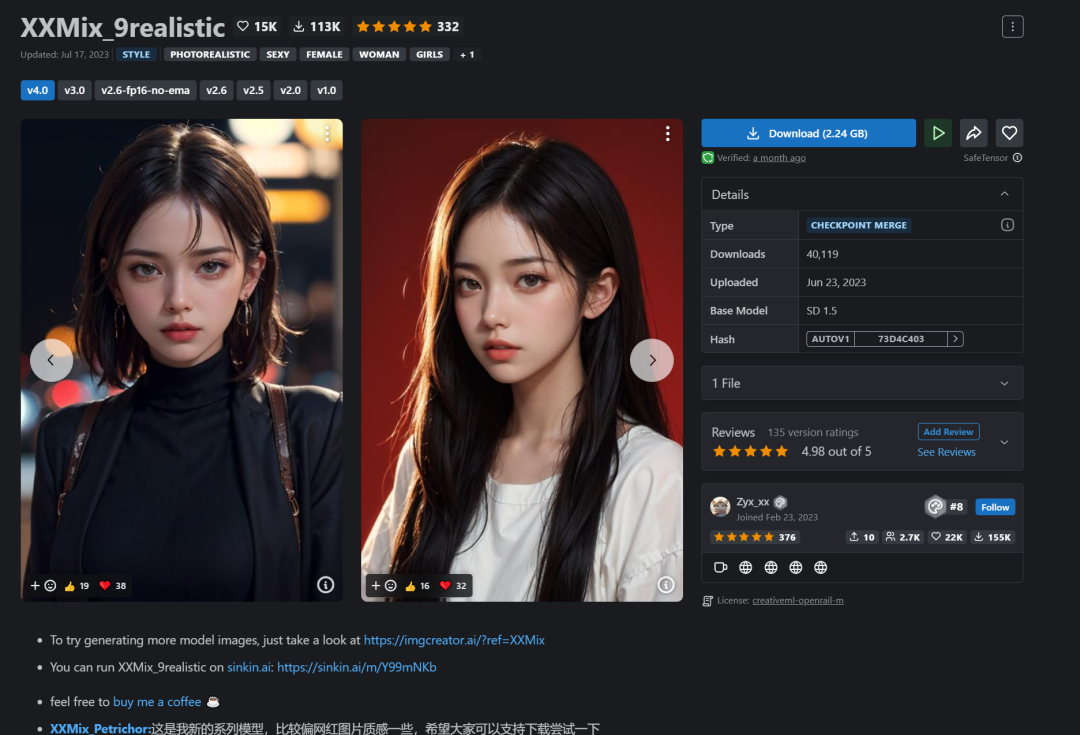 选择其中一个模型,下载按钮就在右边,如果要不同的版本,在下方可以自行选择。(一般推荐下载最新的)下方的介绍相当于抱脸里面的ModelCard,建议你下载前阅读清楚。作者往往会在很多方面指导你该如何使用这个模型。一般会有作者推荐的风格、关键词、分辨率及VAE。