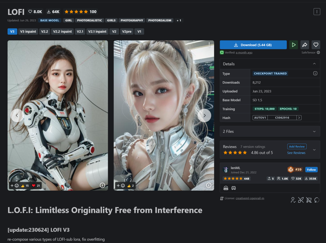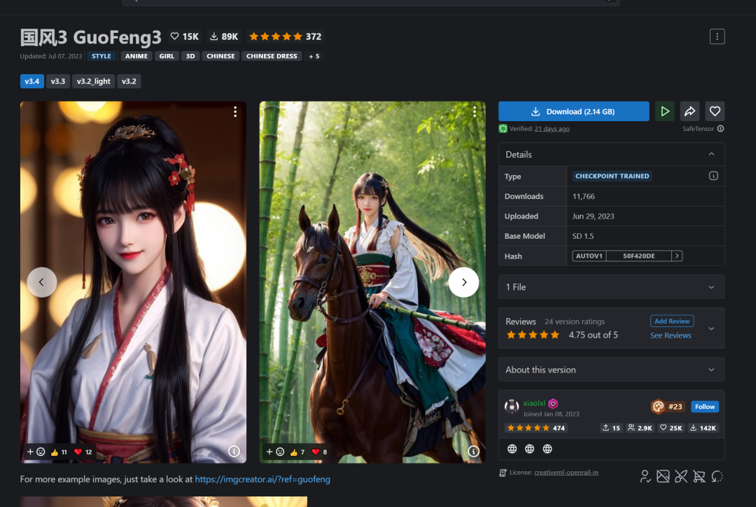 我们训练AI的这个过程会被打包、整合到一个文件里。它们就是AI绘画中最重要的模型了。使用不同风格的模型,你就可以生成不同风格的作品来。这也是为啥AI绘画能做出接近真人的赛博coser了。