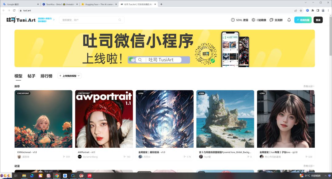 前两个网站属于是比较热门的大模型网站,但是需要科学上网。这里推荐一个国产的模型网站,叫做吐司,这个网站相对其他两个来说可能内容更少一些,但是对于新手来说也够用了。它的界面简单,模型分类也一目了然。看到喜欢的模型点进去就可以下载了,下方同样有很多其他作者用此模型跑出来的图,这里就不过多赘述了。