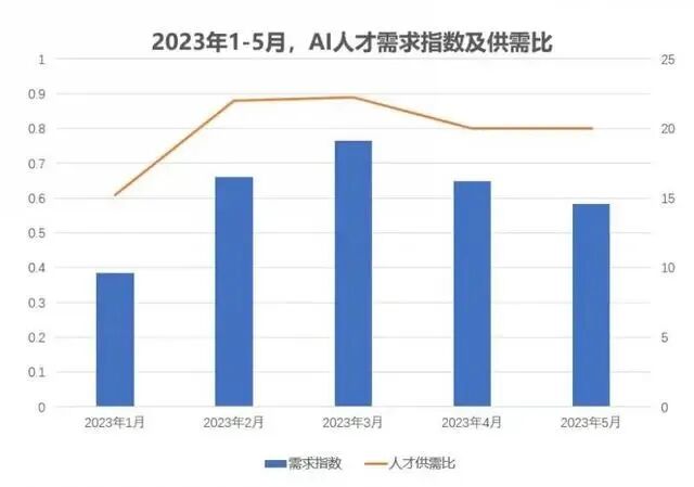 2023年以来,AI人才需求暴涨,供不应求。脉脉高聘数据显示,2023年1-5月,各行各业AI方向人才的供需比均低于1。(数值越小,代表人才缺口越大)