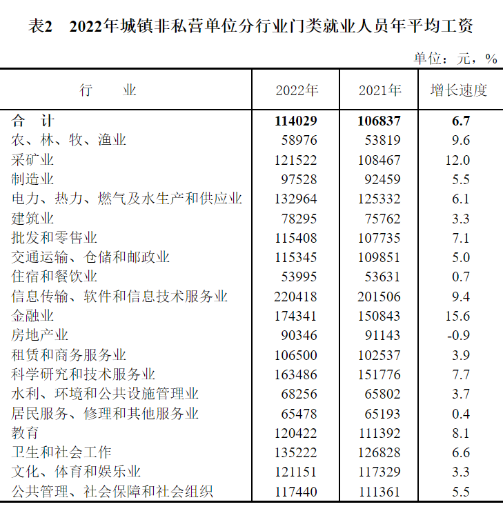 2022年城镇非私营单位分行业门类就业人员年平均工资(图源:国家统计局网站)