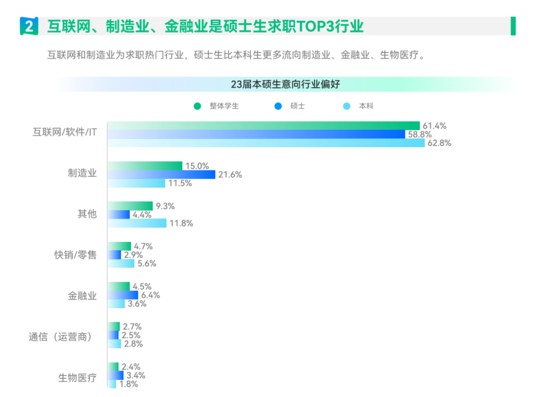 《白皮书》显示,在热门求职行业中,IT互联网依然遥遥领先,在2023届学生的行业偏好中,互联网/软件/IT的占比达61.4%。这说明,IT互联网依旧是大多数应届生心中的理想行业。