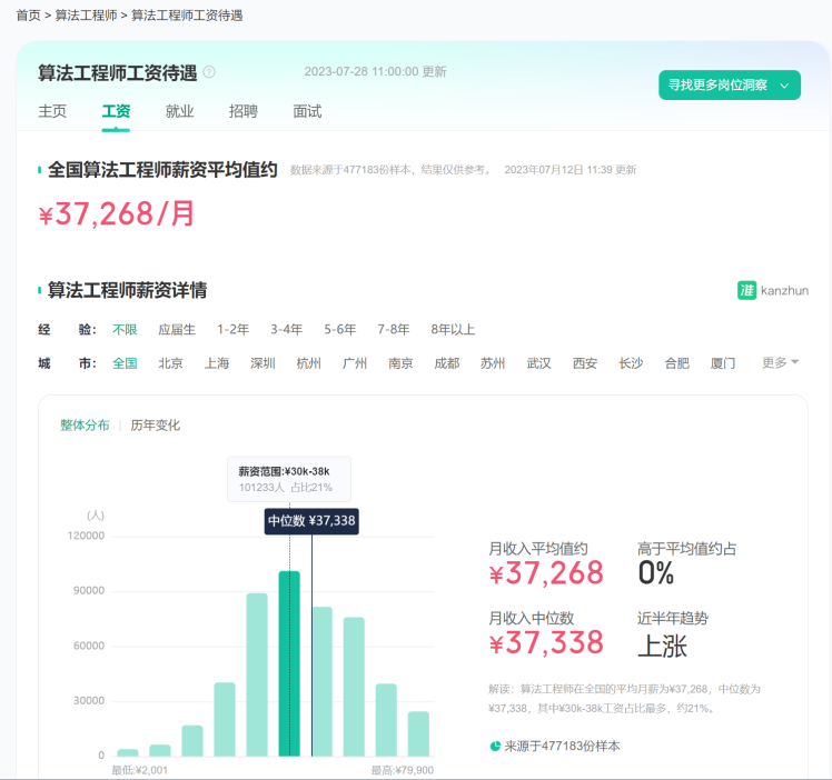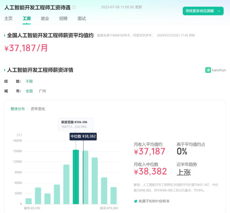 而在看准网上,算法工程师和人工智能开发工程师的平均月薪也高达37k以上。