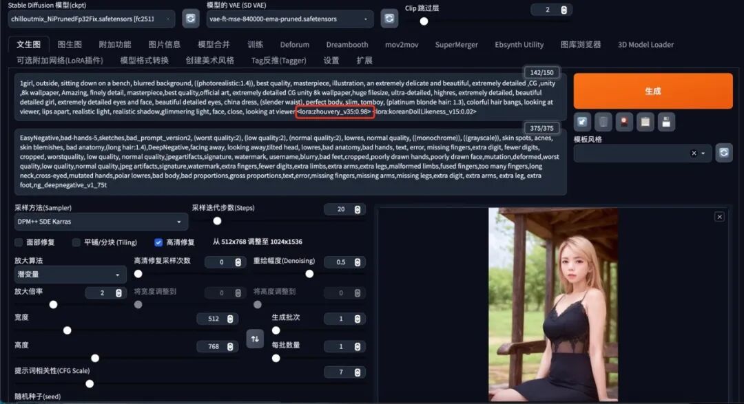红框就是加载输入方式,:0.98是权重,也可以分层混合其他的Lora,效果也许会意想不到,还有其他的物品,比如衣服或者其他的都可以加载。