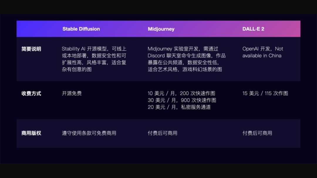 通过对⽐,Stable Diffffusion 在数据安全性(可本地部署)、可扩展性(成熟插件多)、⻛格丰富度(众多模型可供下载,也可以训练⾃有⻛格模型)、费⽤版权(开源免费、可商⽤)等⽅⾯更适合我们的⼯作场景。